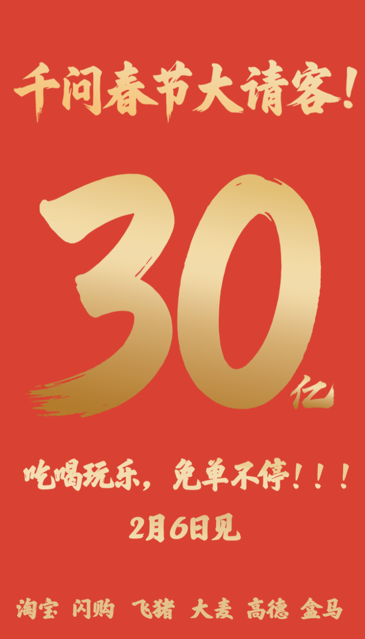 2月2日,千问APP宣布投入30亿启动“春节请客计划”,以免单形式请全国人民在春节期间吃喝玩乐,感受AI时代的全新生活方式。淘宝闪购、飞猪、大麦、盒马、天猫超市、支付宝等阿里生态业务也将加入千问春节攻势。